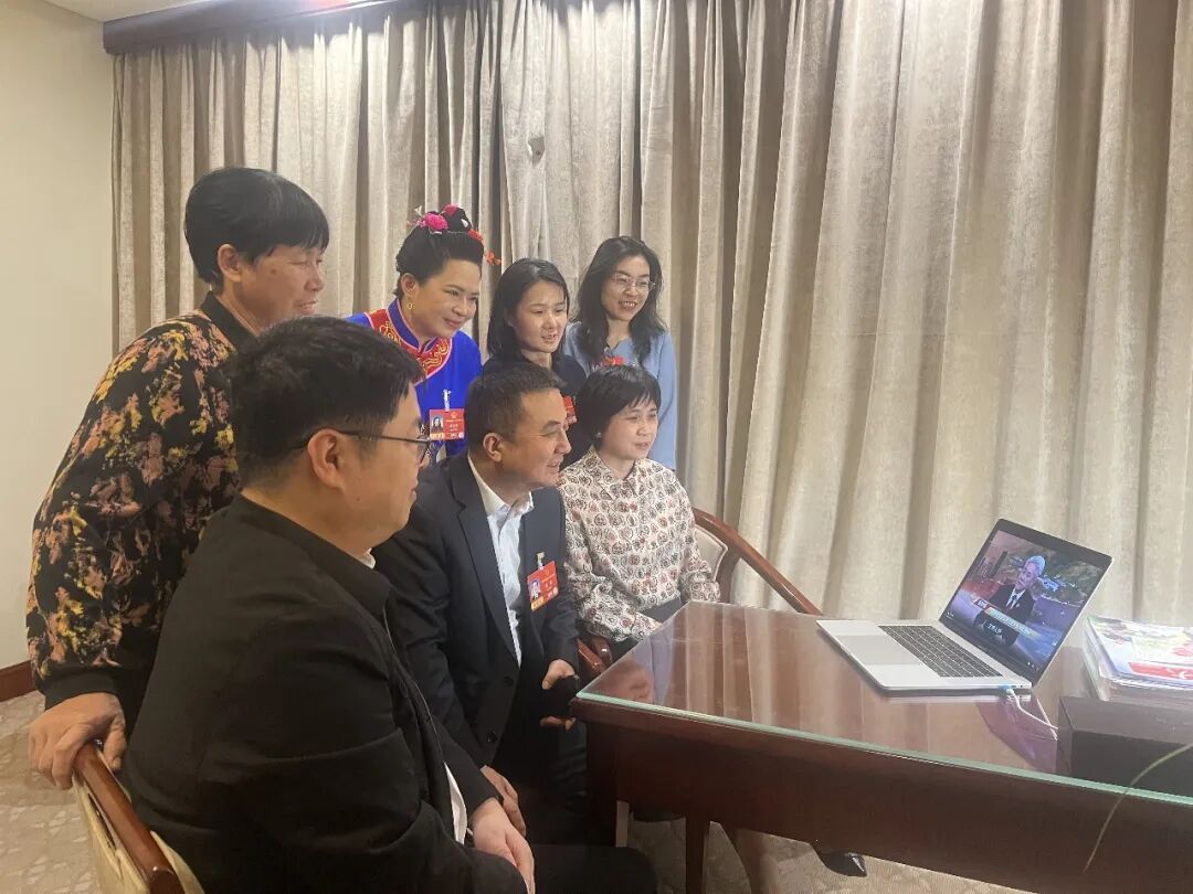 图为全国人大代表们在驻地收看《现场对话大法官》第三季(第一排由左至右分别为:翁祖铨、温青、刘爱英。第二排由左至右分别为:许光园、曾云英、钟团玉、秦源。)