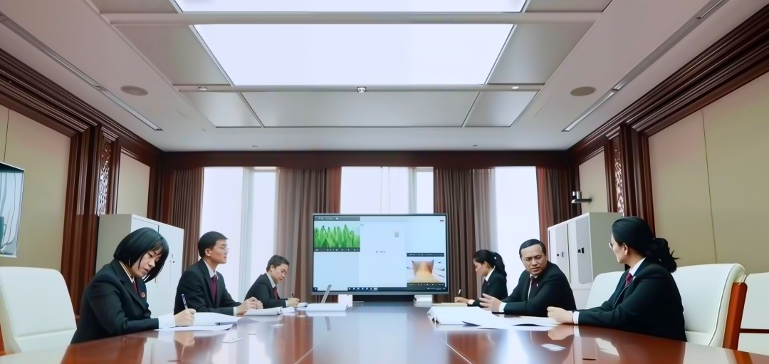 图为最高人民法院知识产权法庭办案合议庭对某玉米新品种侵权案进行探讨。