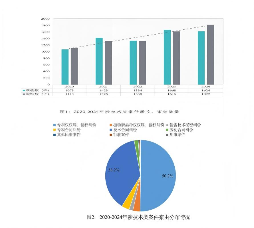 专利权权属、侵权纠纷和技术合同纠纷占比均达85%以上(审结案件案由分布详见图2),反映出公众尊重创新、尊重知识的意识仍需进一步深化,一些经营者恶意侵占、使用他人技术成果,因未有创新成本而以低价恶性竞争、“内卷式”竞争等现象,需引起关注。技术合同纠纷新收案件从2020年的370件增长至2024年的804件,增长率为117.3%,反映出技术成果转化在愈加受到重视的同时,知识产权法律意识尚需进一步强化。一些当事人守约意识淡薄,转化合同权利义务内容约定不明,创新与转化衔接不畅,实验室成果产业化程度有待提高等问题,制约了产学研深度融合和科技成果的有效转化。此外,企业技术秘密被侵害情形显著增多,新收侵害技术秘密纠纷从2020年的46件增长至2024年的95件,增长率为106.5%,其中82.3%的侵害商业秘密案件与员工“跳槽”直接相关。侵权人为获取竞争优势、抢占市场份额,非法取得、披露、使用他人技术秘密导致此类案件增多,不仅使企业失去关键技术支撑,延缓产业创新进程,甚至导致相关产业的国际竞争力下降。同时,这也暴露出部分企业商业秘密保护意识薄弱,对离职、“跳槽”员工的脱密管理、保密约束等制度建设不完善。